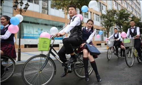 “三八”国际劳动妇女节,男生骑单车送女生上课 上演浪漫小清新